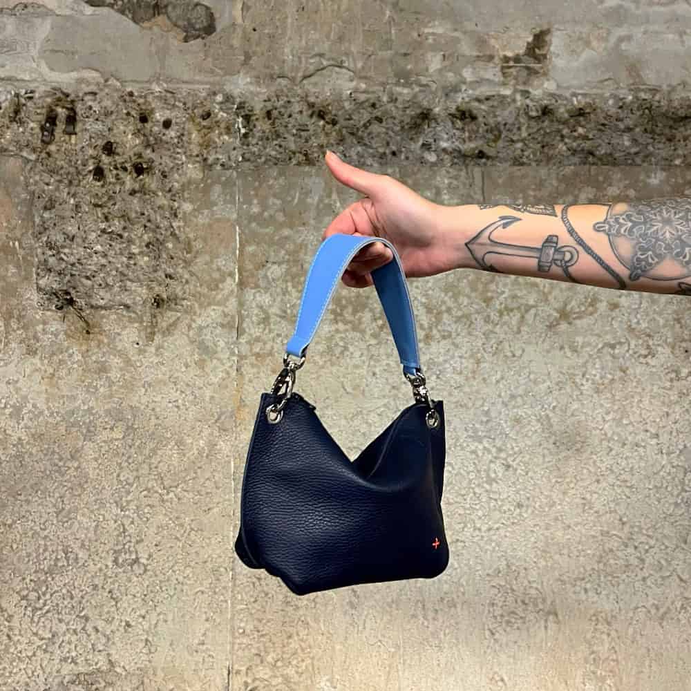 Tas van donkerblauw leer, met een kort hemelsblauw hengsel.