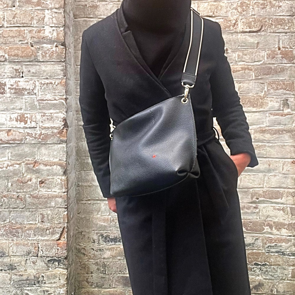 Grote, zwarte leren tas, met een crossbody, zwart hengsel van stof met ecru randen.