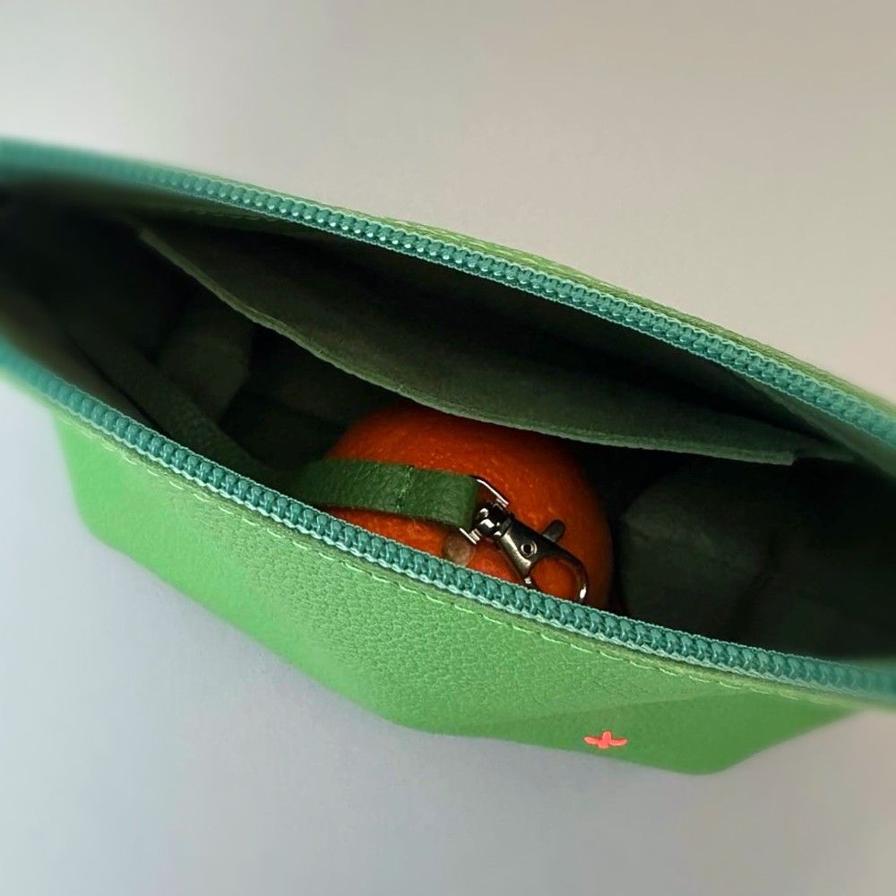 Tas van appelgroen leer, met een crossbody lila verstelbaar schouderhengsel.