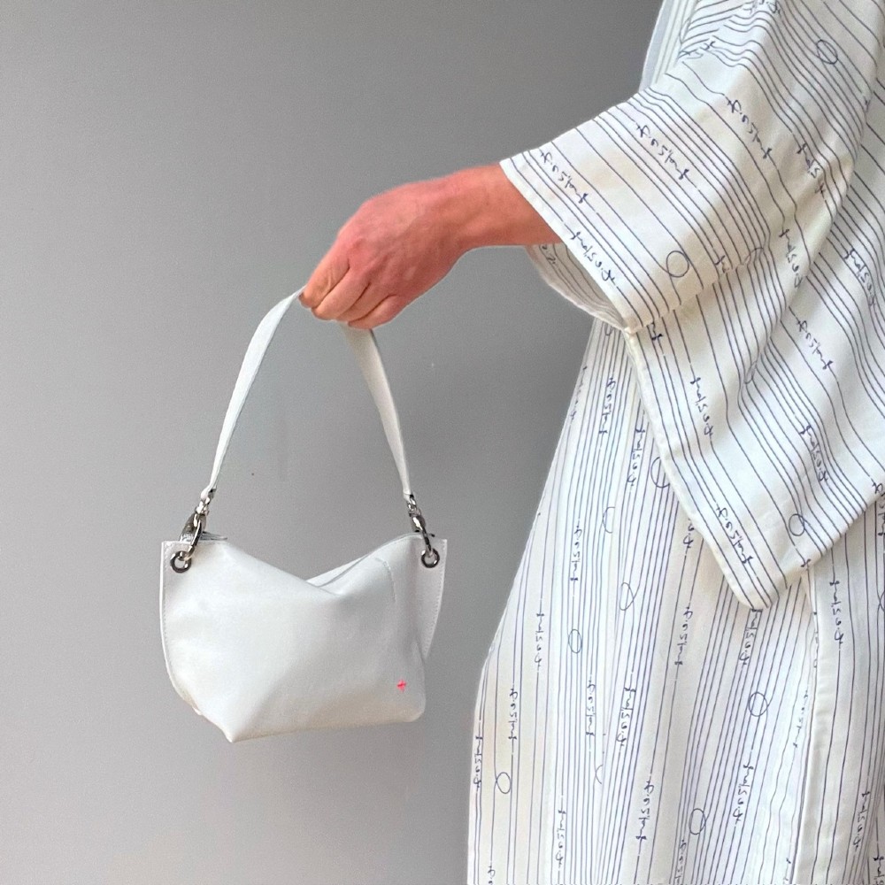 Tas van crème leer, met een kort leren crème hengsel.