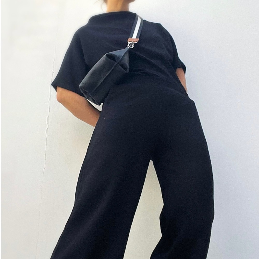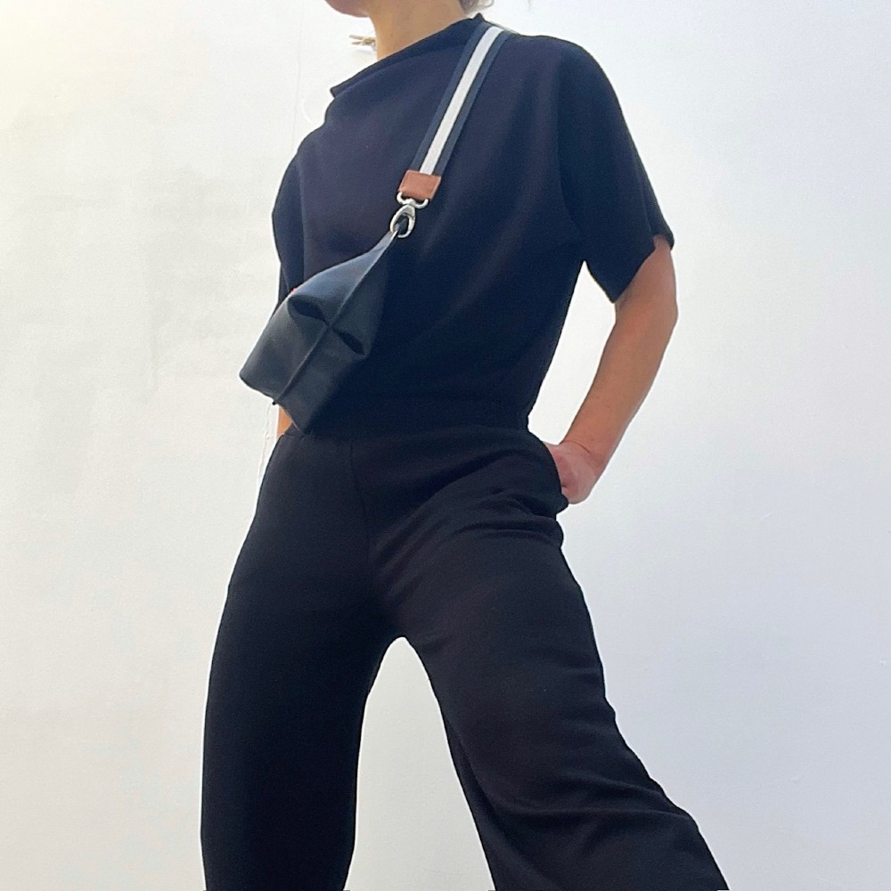 Zwarte leren tas, met een crossbody zwart-wit gestreept verstelbaar schouderhengsel, (cognac details van leer)