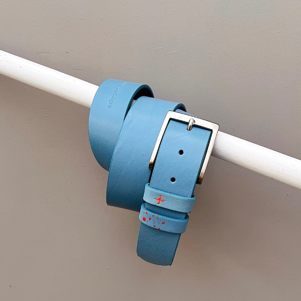 Vier cm brede dames/heren riem lichtblauw met oranje details.