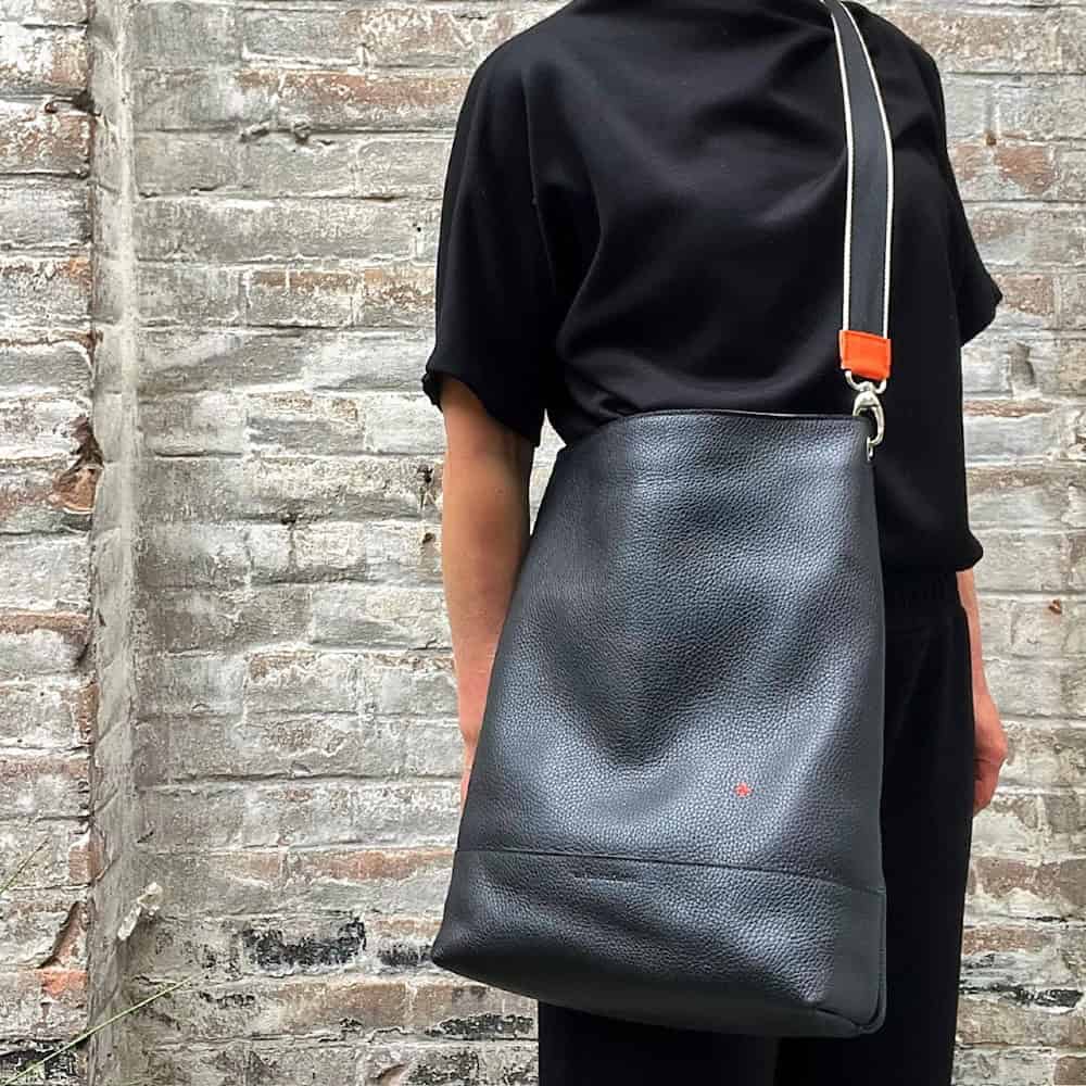 Laptoptas van zwart, soepel leer. Gevoerd, afsluitbaar met een rits, met verstevigd laptopvak, telefoon vak, zijritsvak, pennenvak en natuurlijk een sleutelleertje. Met verwisselbaar, crossbody hengsel met oranje details.