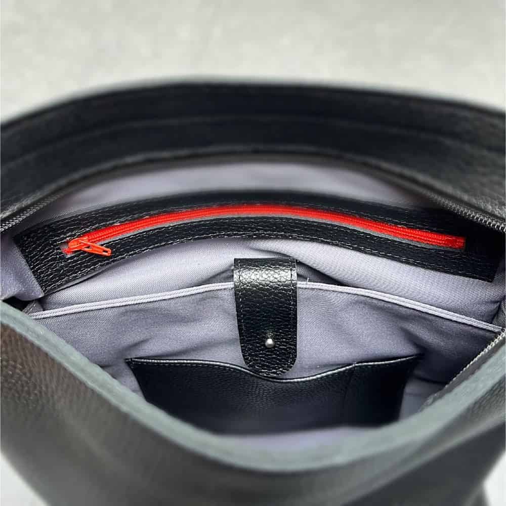 Aan de achterkant zit een vakje voor je pasje van je werk, of je treinkaart, zodat je dat snel kunt pakken. Je telefoon zou er evt. ook in passen.