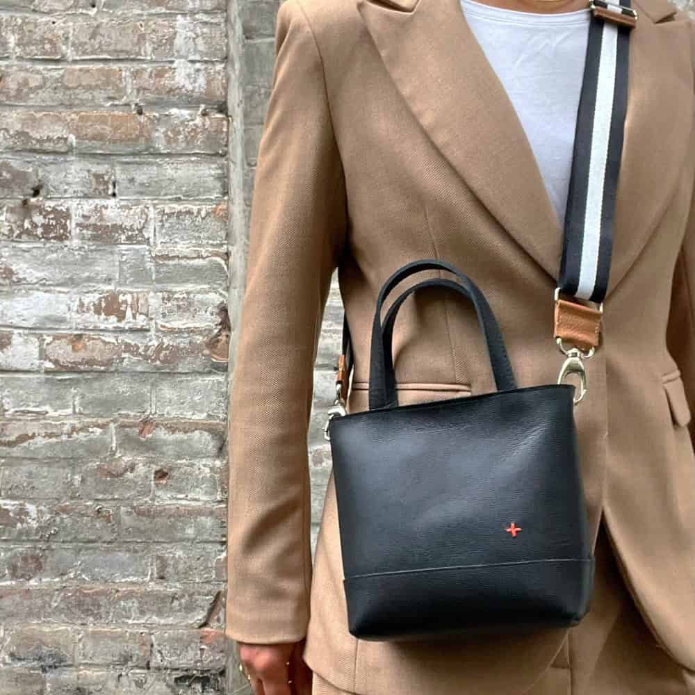 Inclusief een zwart/wit gestreept, crossbody hengsel met cognac details.
